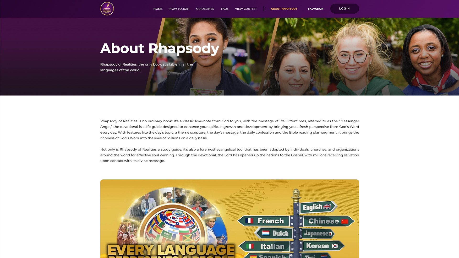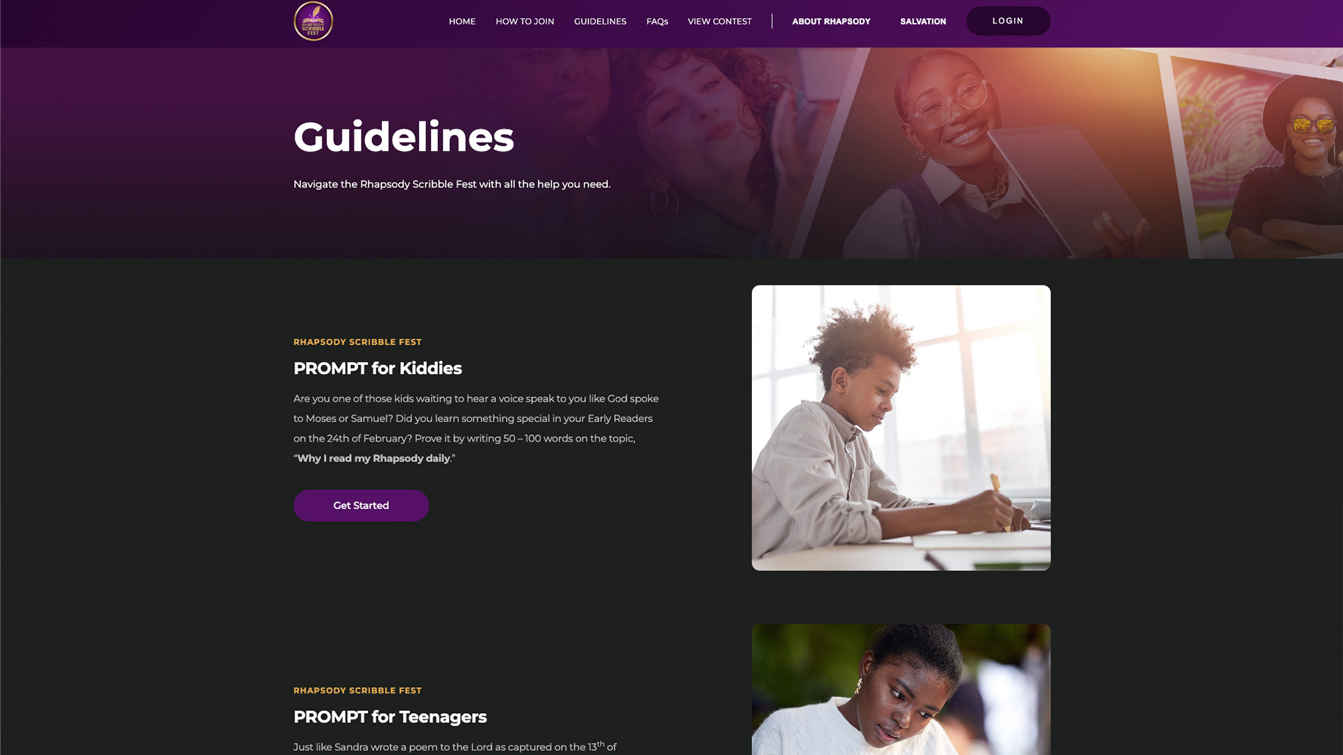 The Rhapsody Scribble Fest is a comprehensive web platform designed to host a global writing competition centered around the "Rhapsody of Realities" devotional. This project showcases a complete contest management system built with Webflow and enhanced with PHP backend integration. The platform features multiple age categories (Kiddies, Teens, and Adults) with tiered entry fees and progressive prize structures including tablets, mobile phones, and laptops. The system handles user registration, profile management, submission tracking, and voting mechanisms while supporting content in over 8,123 languages worldwide. The design emphasizes accessibility and user engagement through vibrant visuals, clear navigation, and comprehensive FAQ sections. The platform demonstrates advanced web development skills by seamlessly integrating Webflow's visual design capabilities with robust PHP backend functionality to create a scalable, multilingual contest management system that can handle global participation and complex voting algorithms.