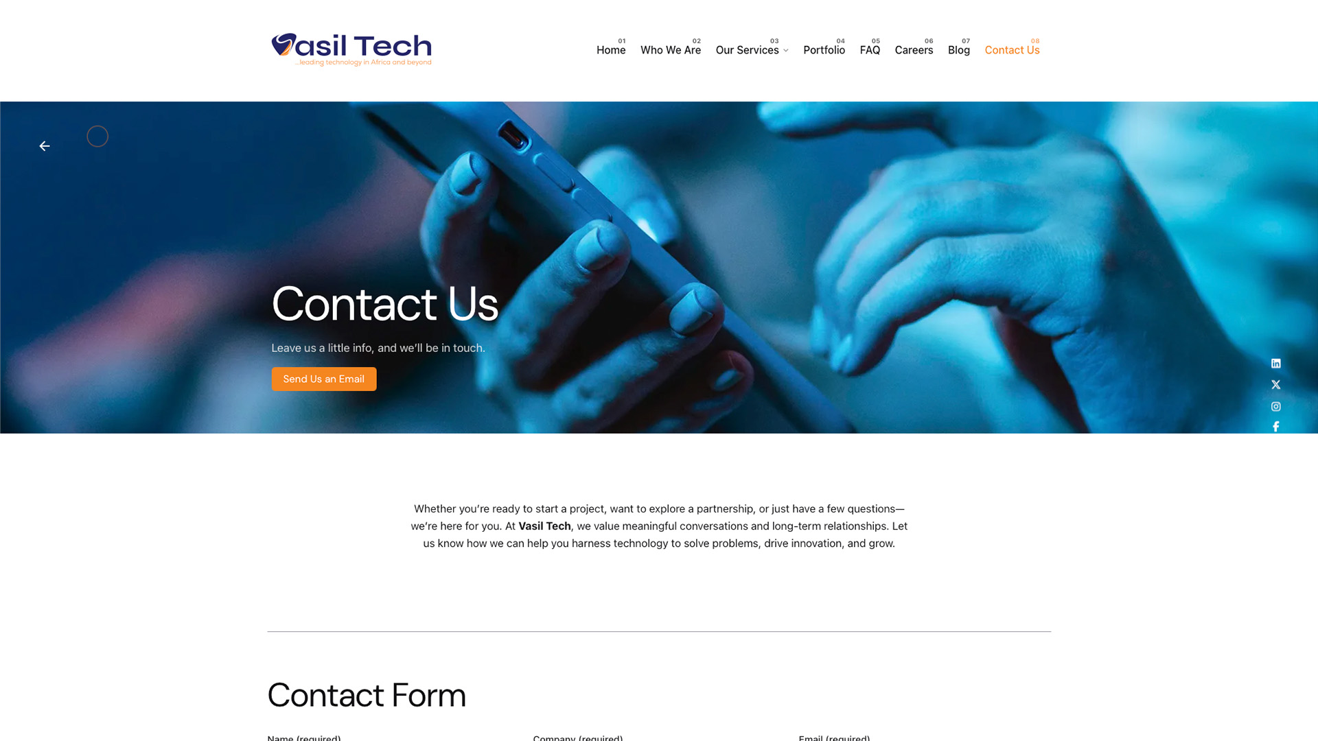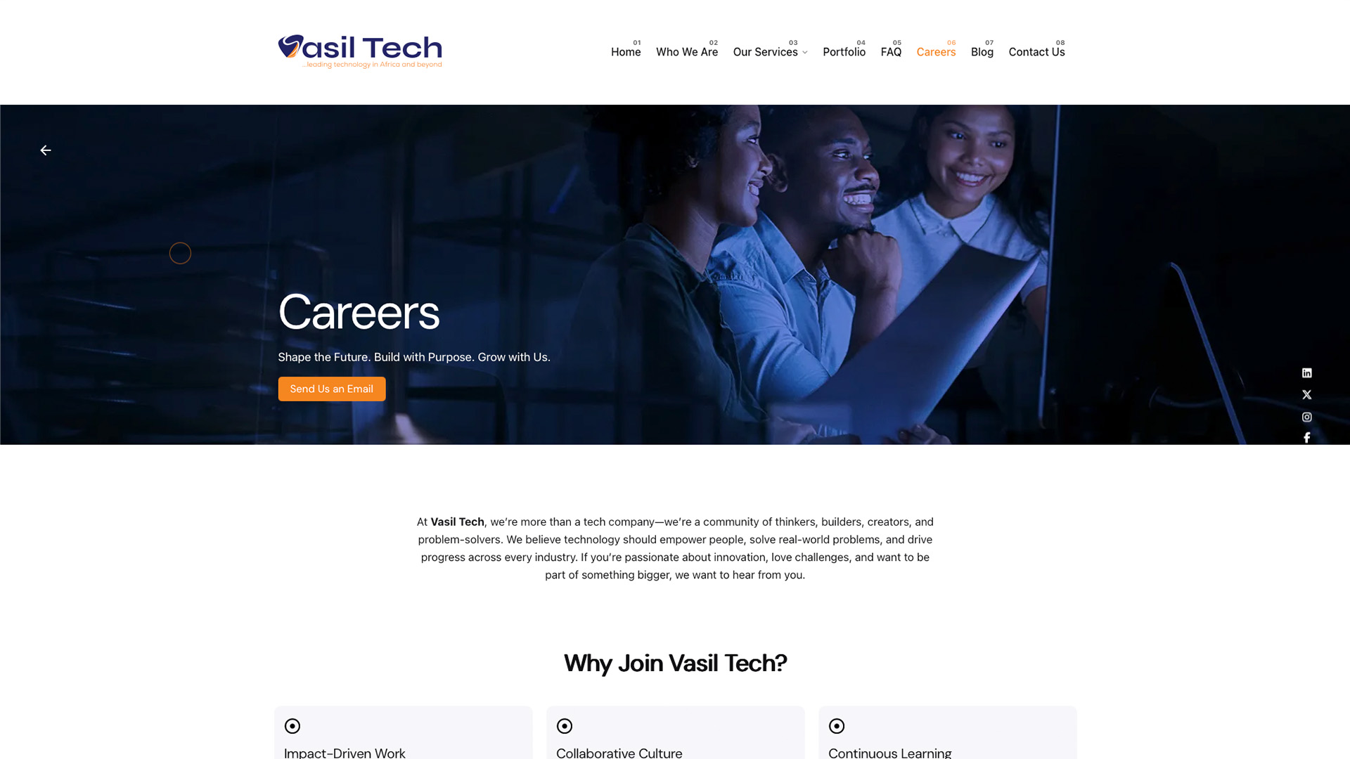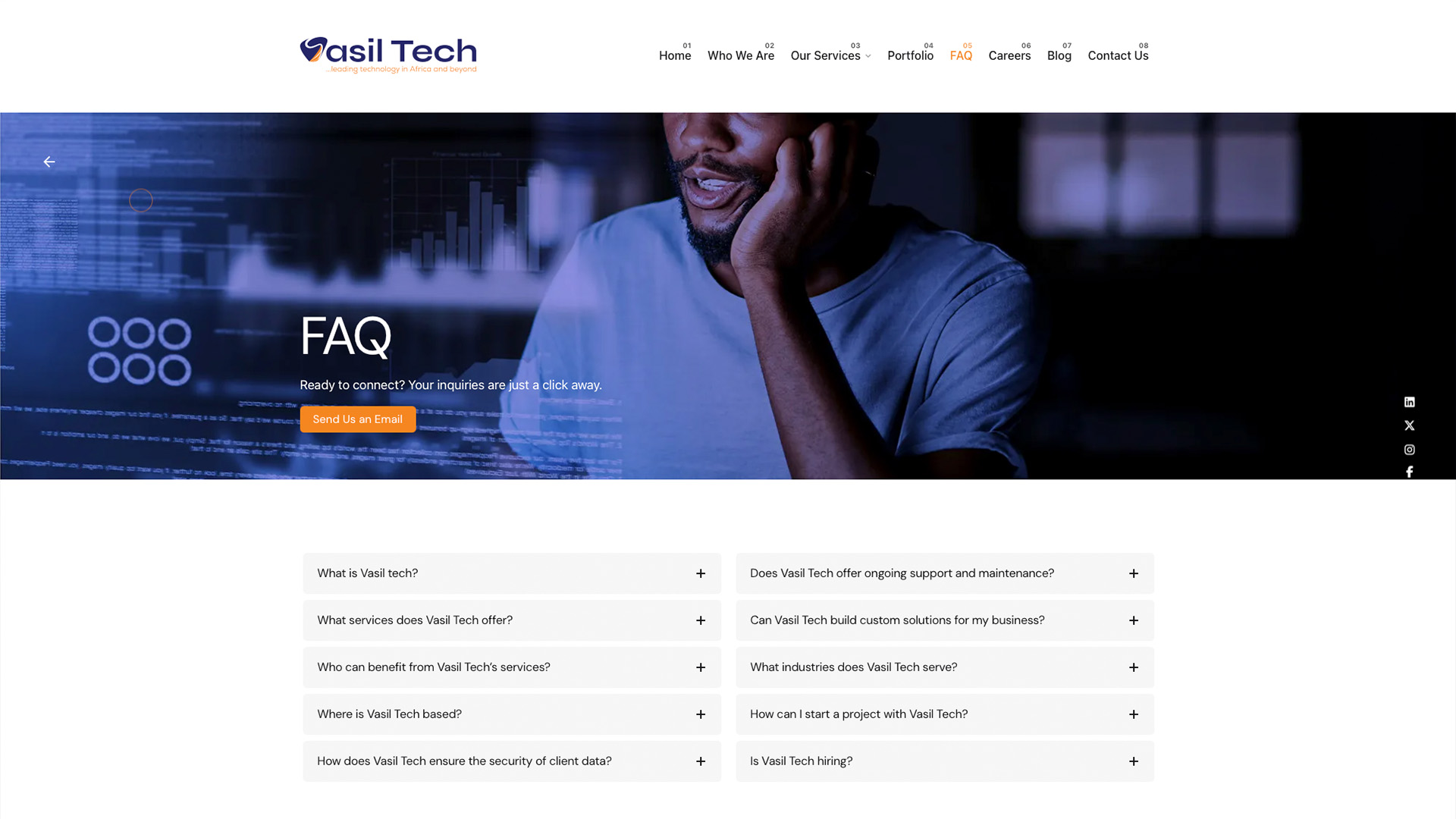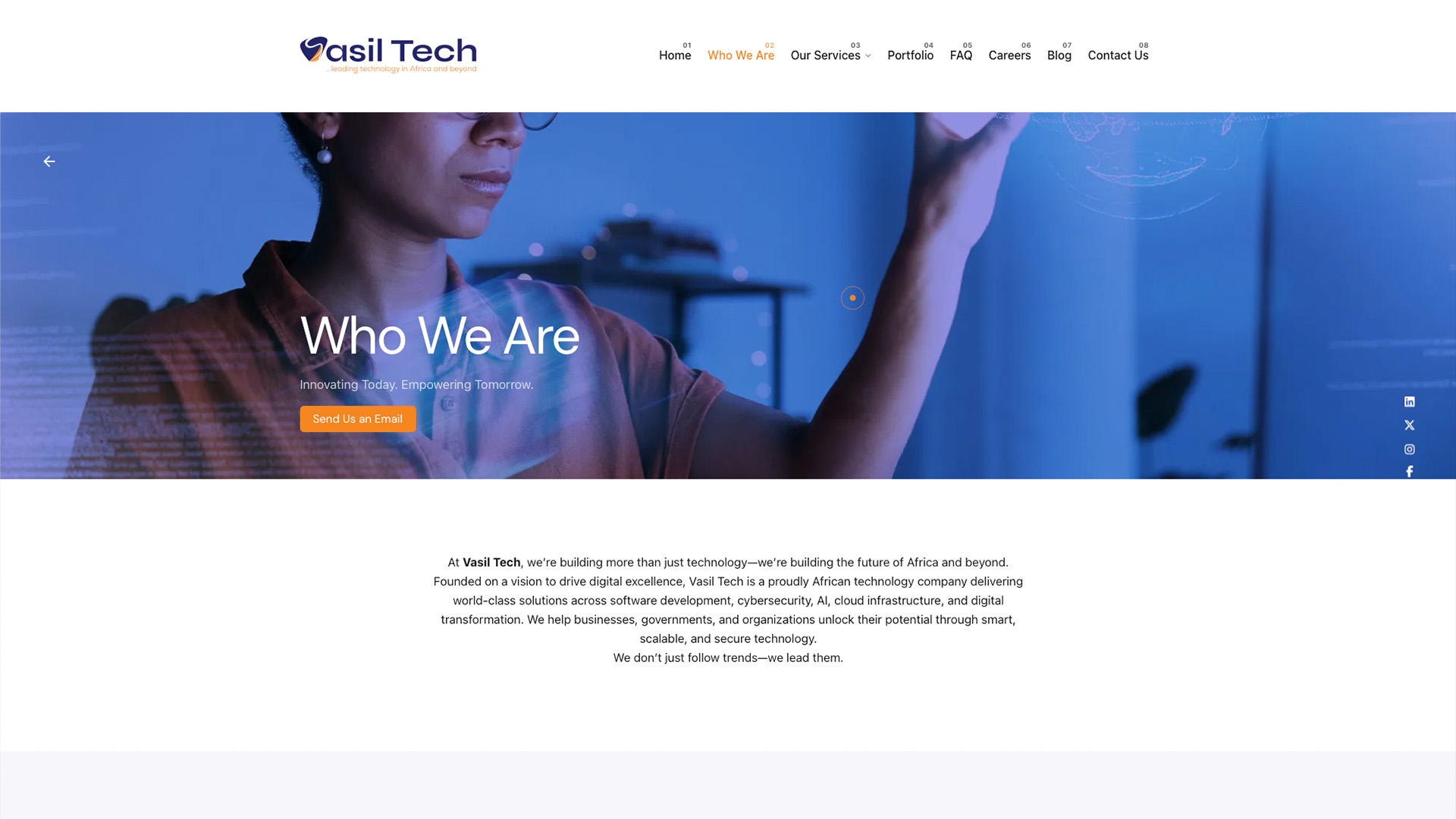 The Vasil Technologies website represents a comprehensive digital transformation project for an emerging African tech company that positions itself as "building the future of Africa and beyond." Built using WordPress, this modern, professional website showcases the company's expertise in software development, cybersecurity, AI, cloud infrastructure, and digital transformation services. The site features a contemporary design with engaging hero sections, interactive elements, and strategic use of blue-toned imagery that conveys innovation and trust. Key sections include detailed service offerings, an informative FAQ section, career opportunities highlighting their collaborative culture and continuous learning environment, and a streamlined contact system. The website effectively communicates Vasil Tech's mission to "develop technological solutions to everyday issues that are hindering development in Africa" Who We Are - Vasil Technologies while establishing credibility through client testimonials and a professional portfolio showcase. The responsive design ensures optimal user experience across all devices while maintaining the company's brand identity as forward-thinking technology innovators.